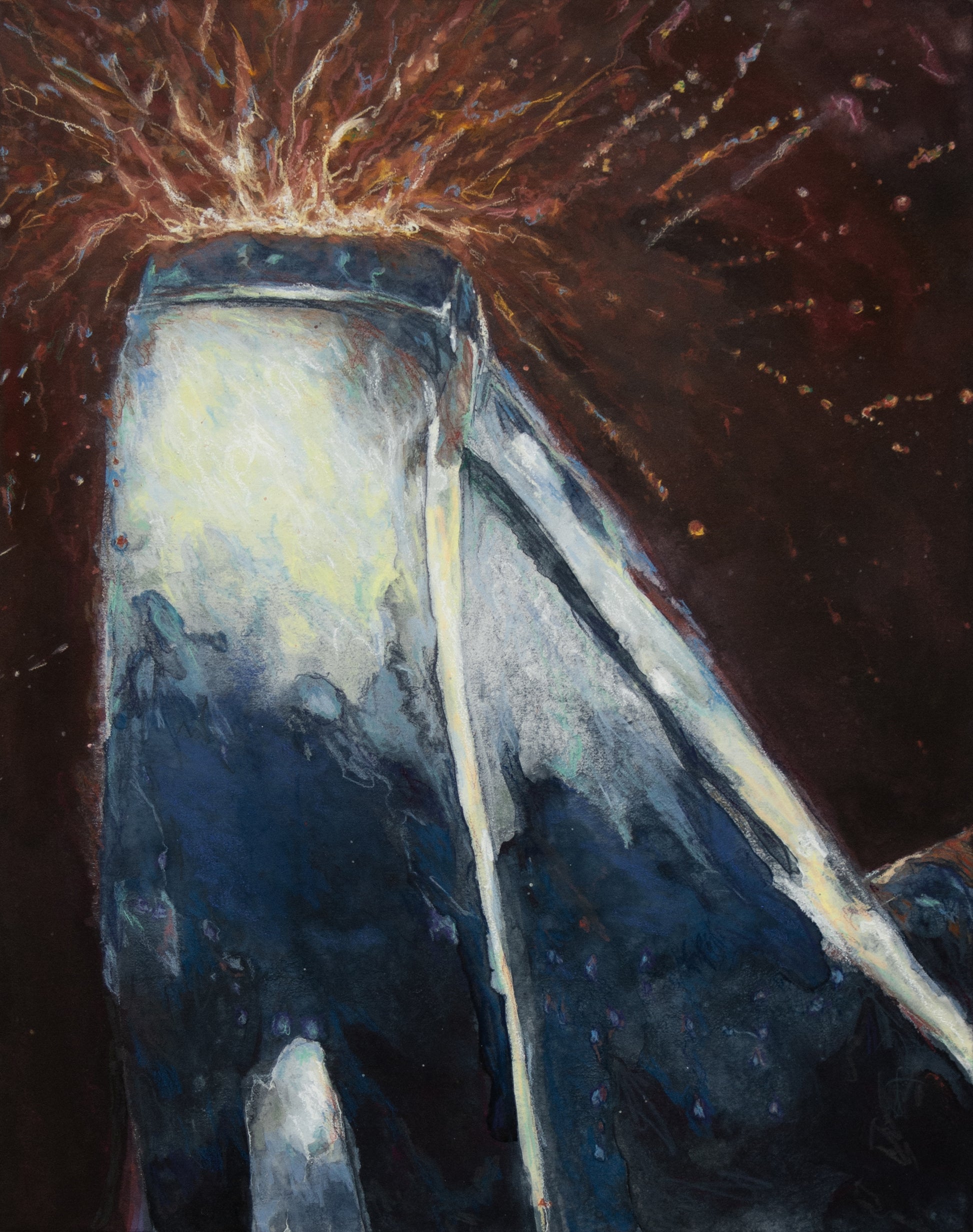 This painting is inspired by the Großer Windkanal in Berlin. Its massive concrete structure shifts into something cellular, cosmic, almost geological. I wanted to capture that moment of transition when what seemed unyielding gives way and a more elemental presence emerges.